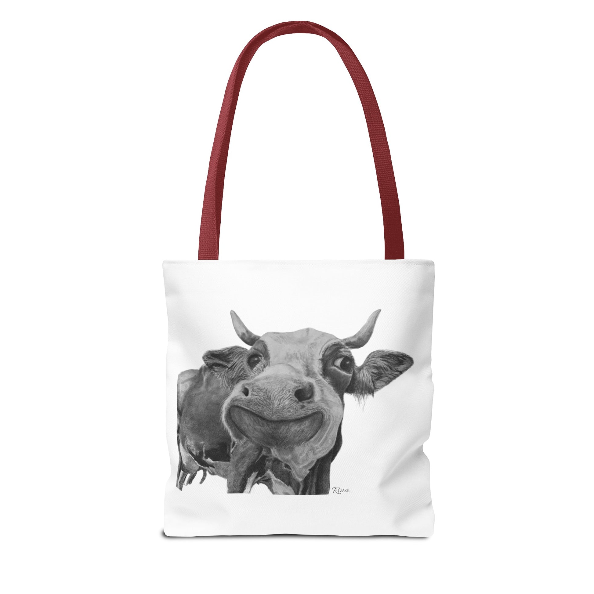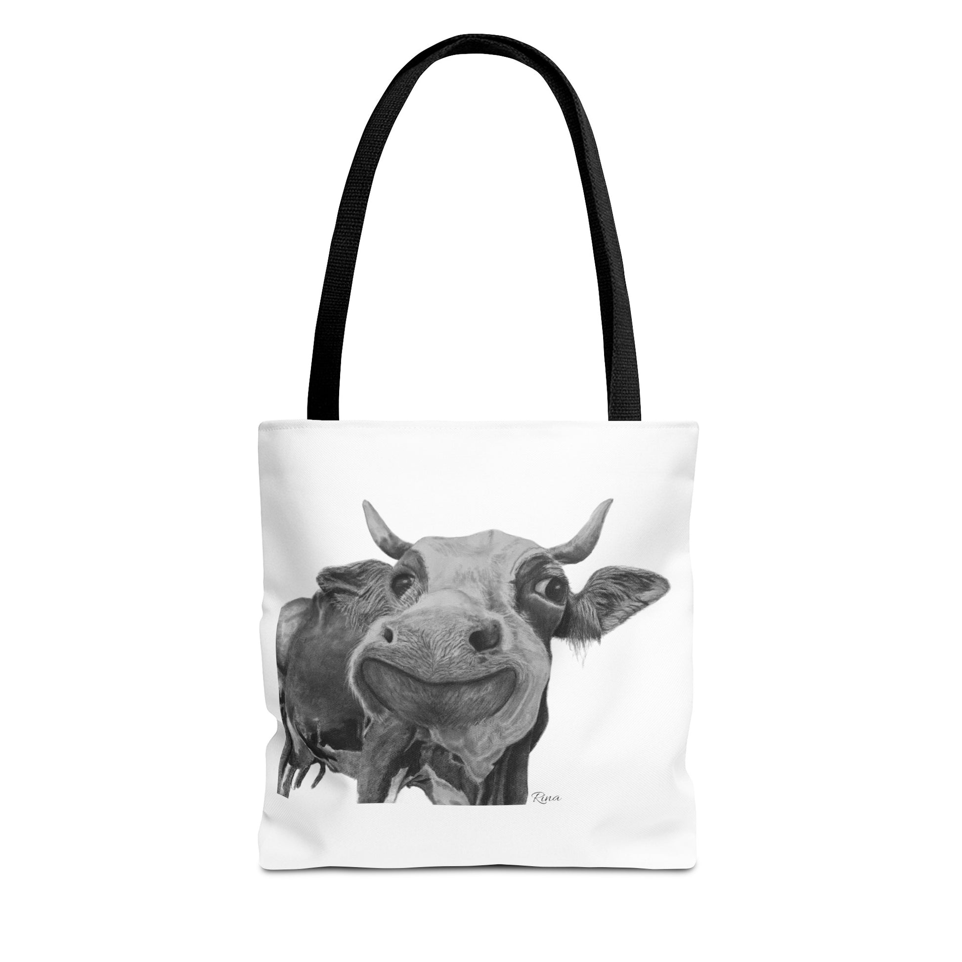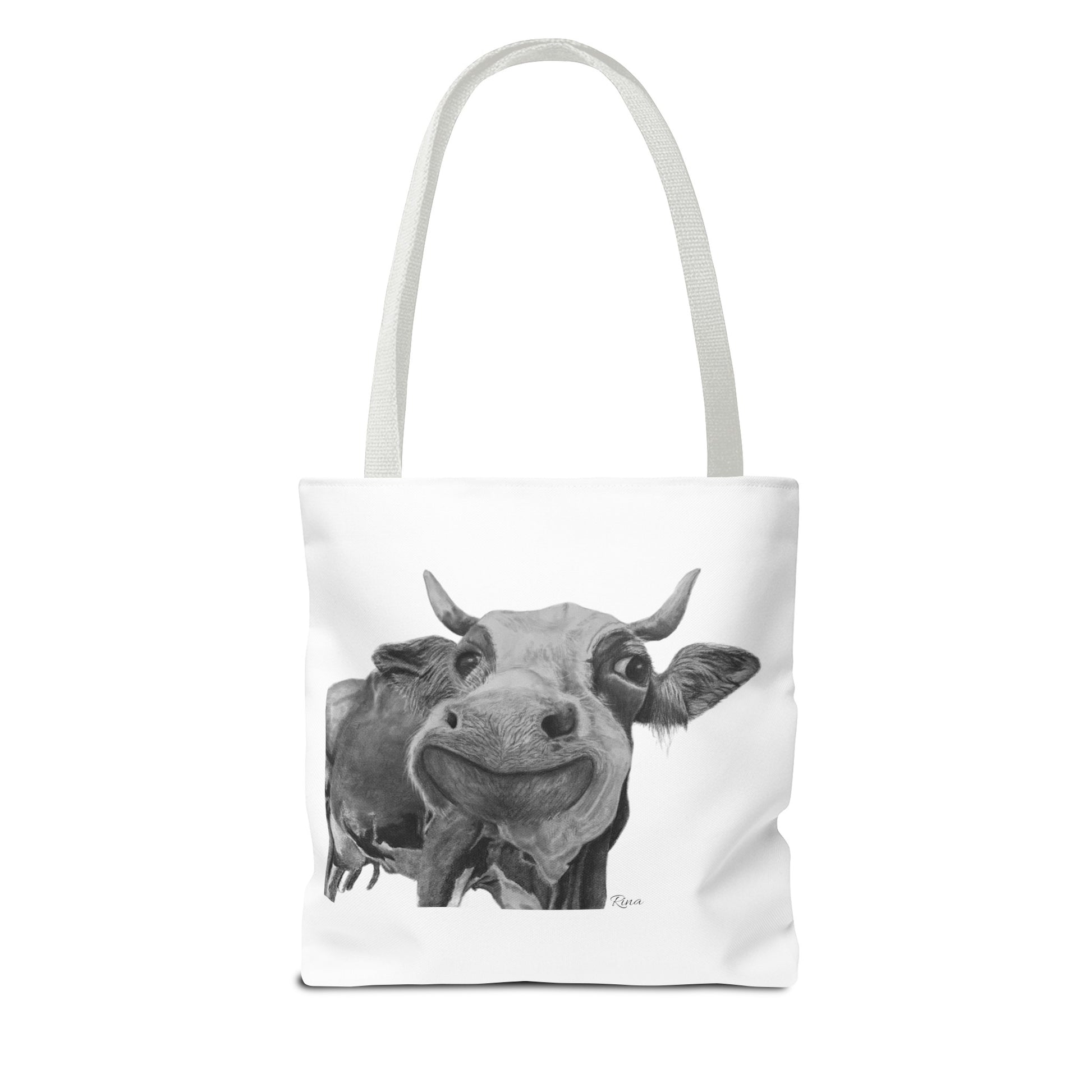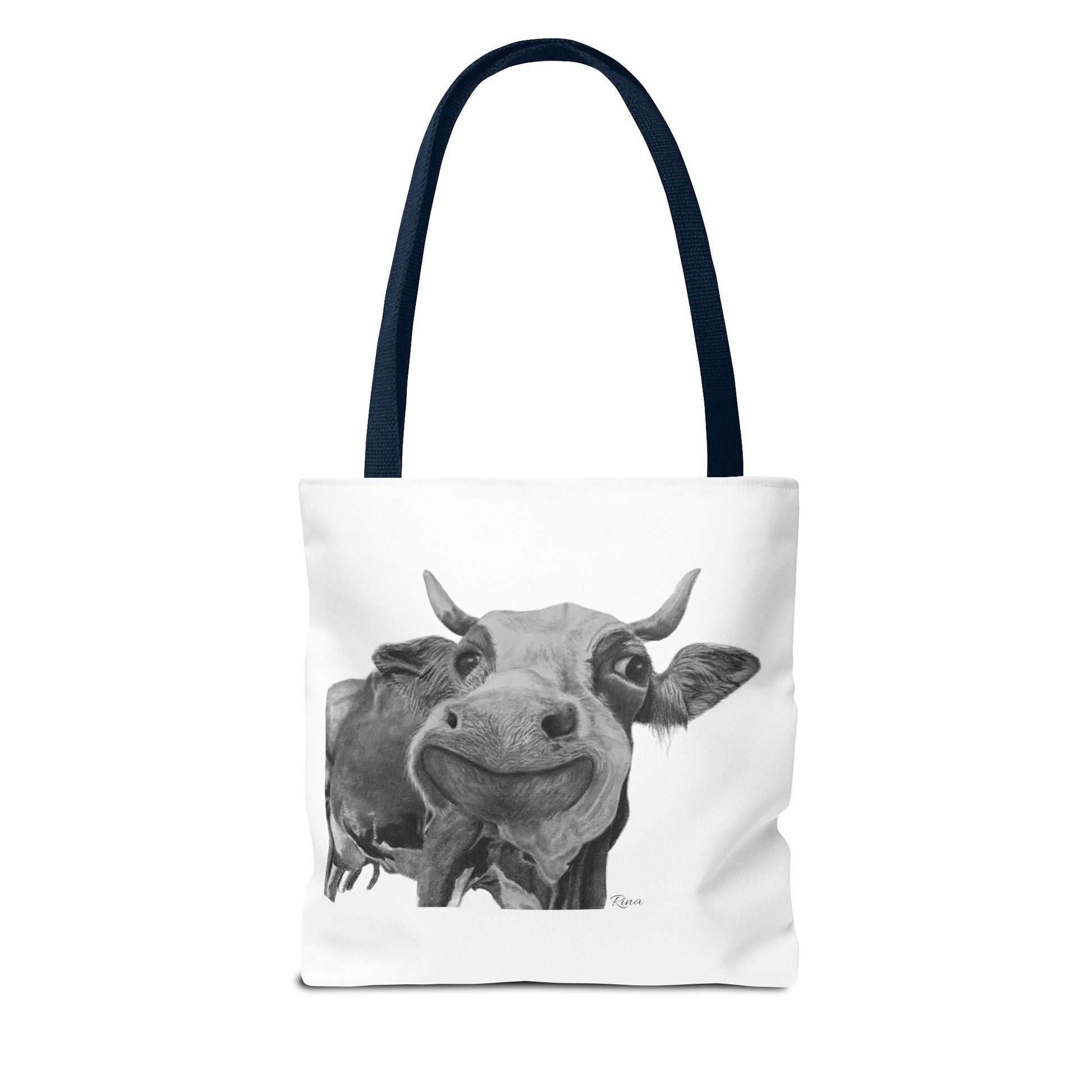 Design drawn and created by artist, Rina Vance! Hand drawn design printed to this cute tote bag! Bring the happy cow wherever you go! Makes a great gift!