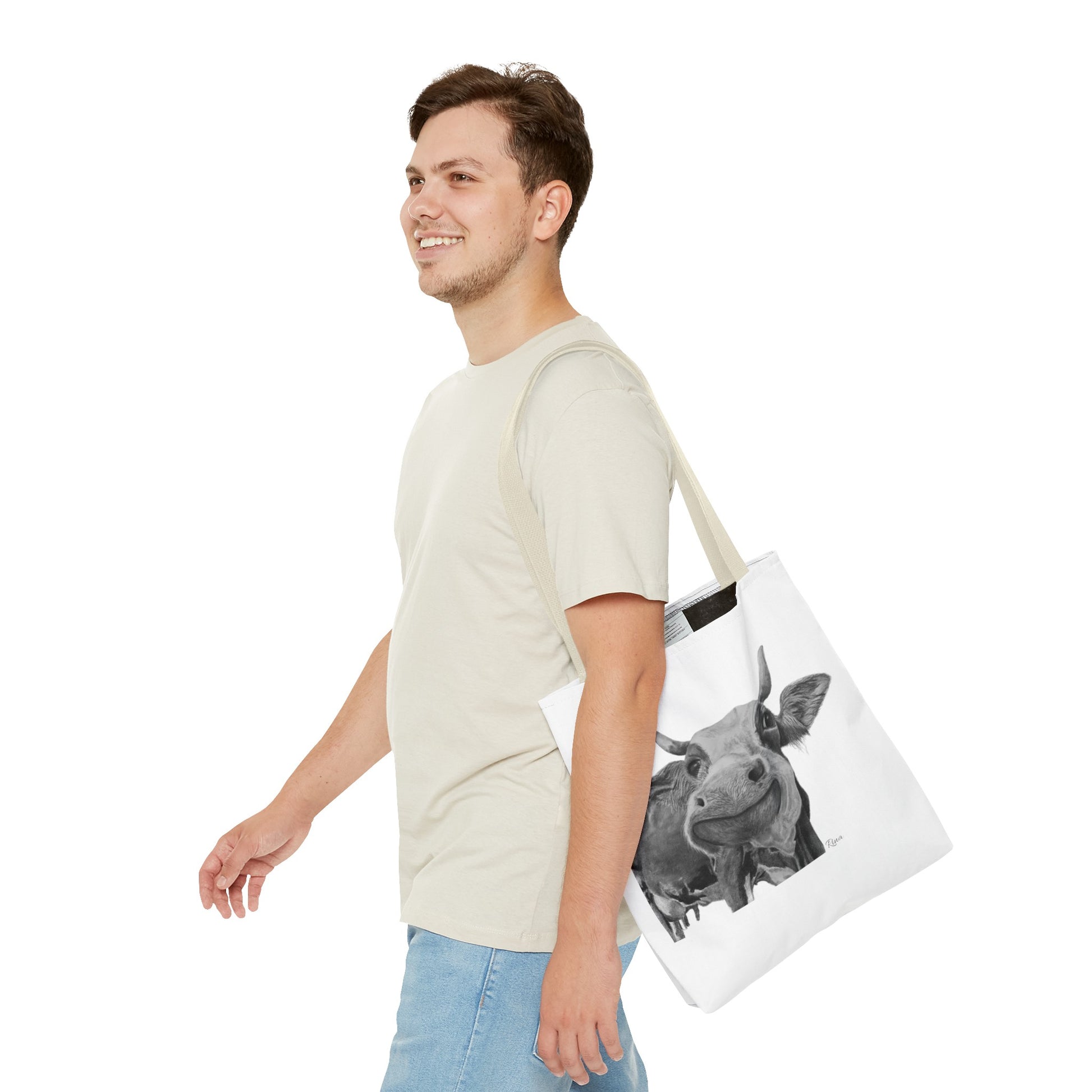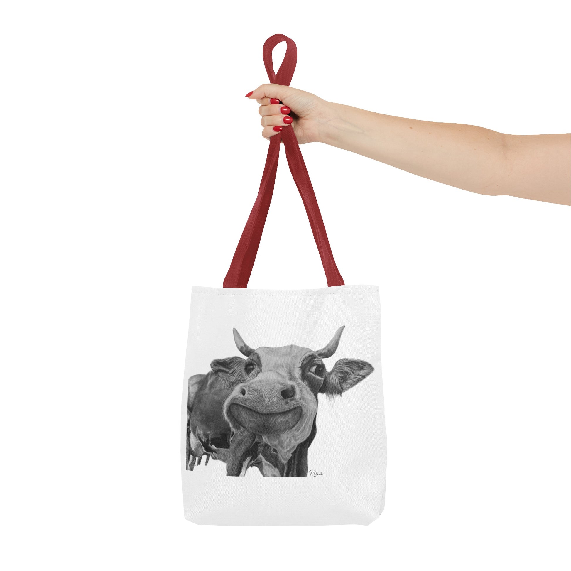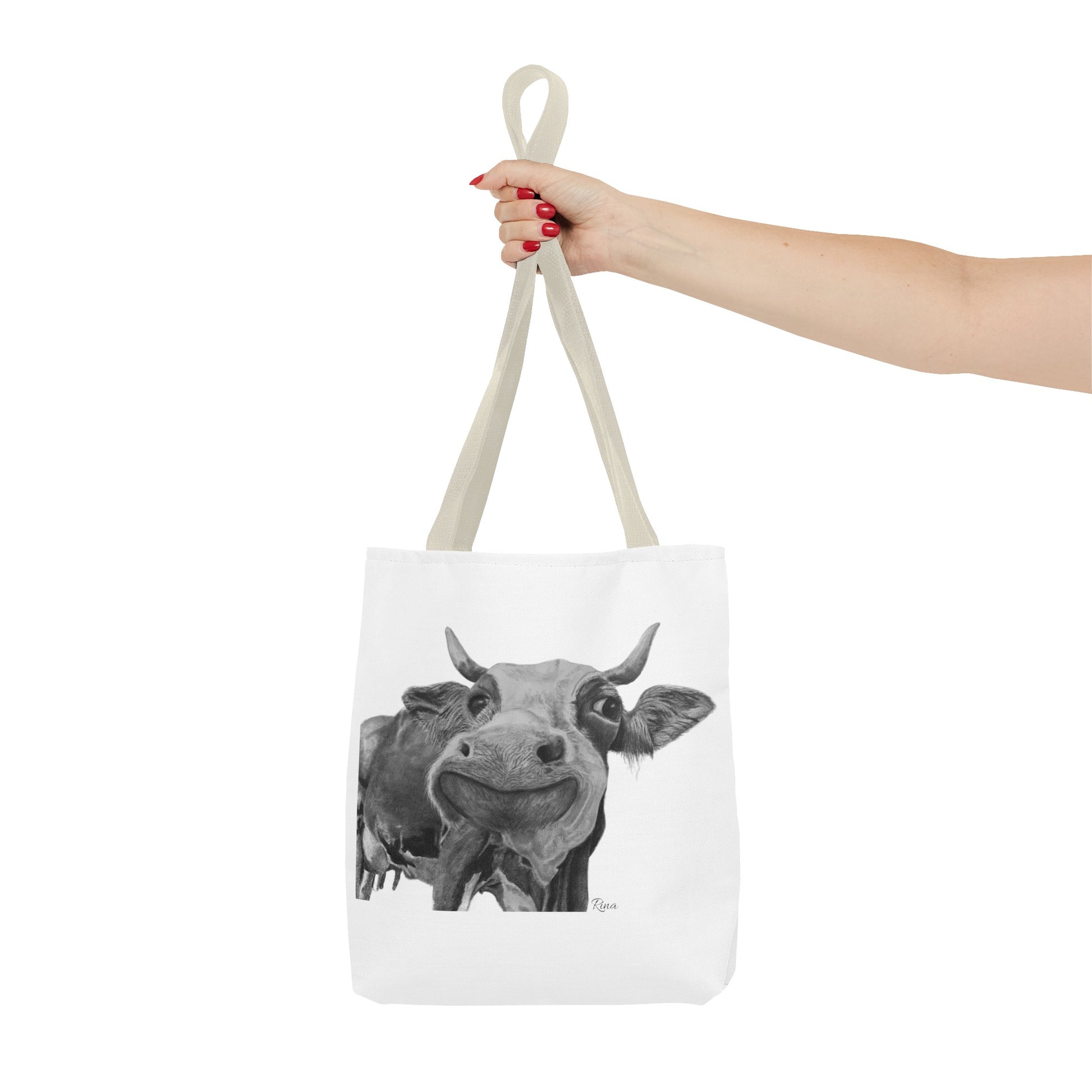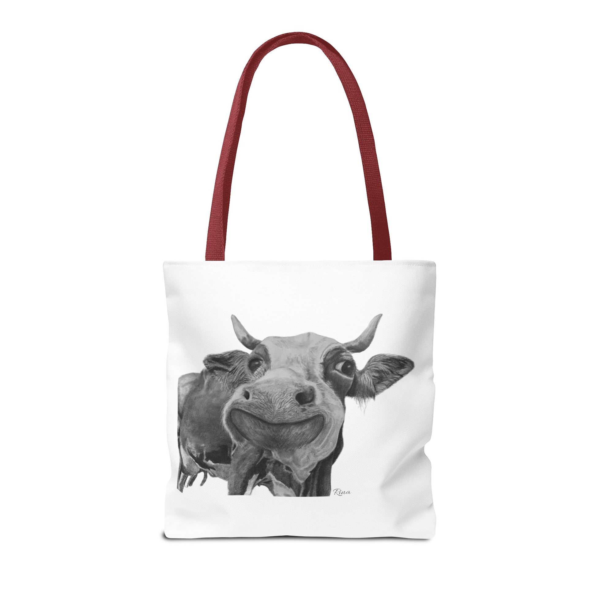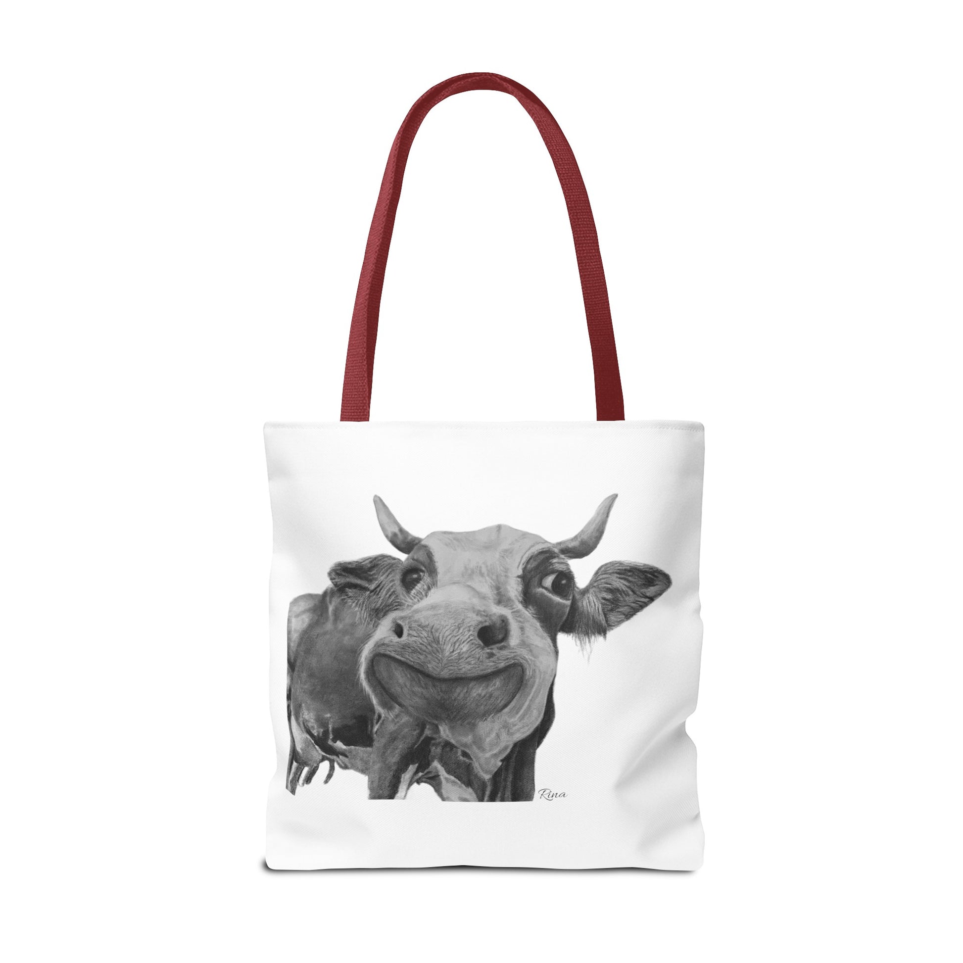 Design drawn and created by artist, Rina Vance! Hand drawn design printed to this cute tote bag! Bring the happy cow wherever you go! Makes a great gift!
