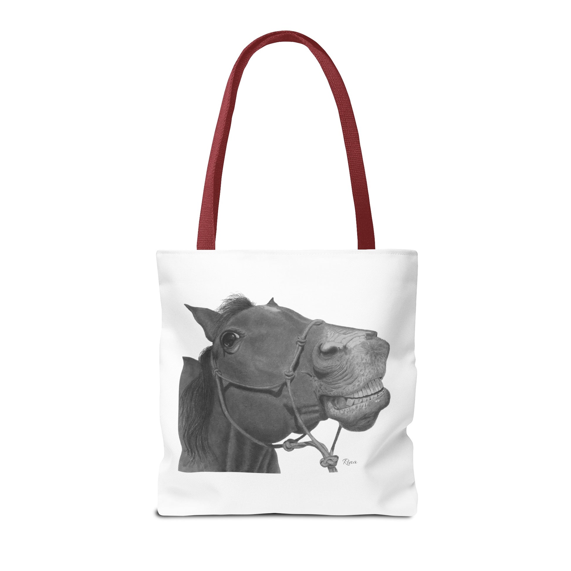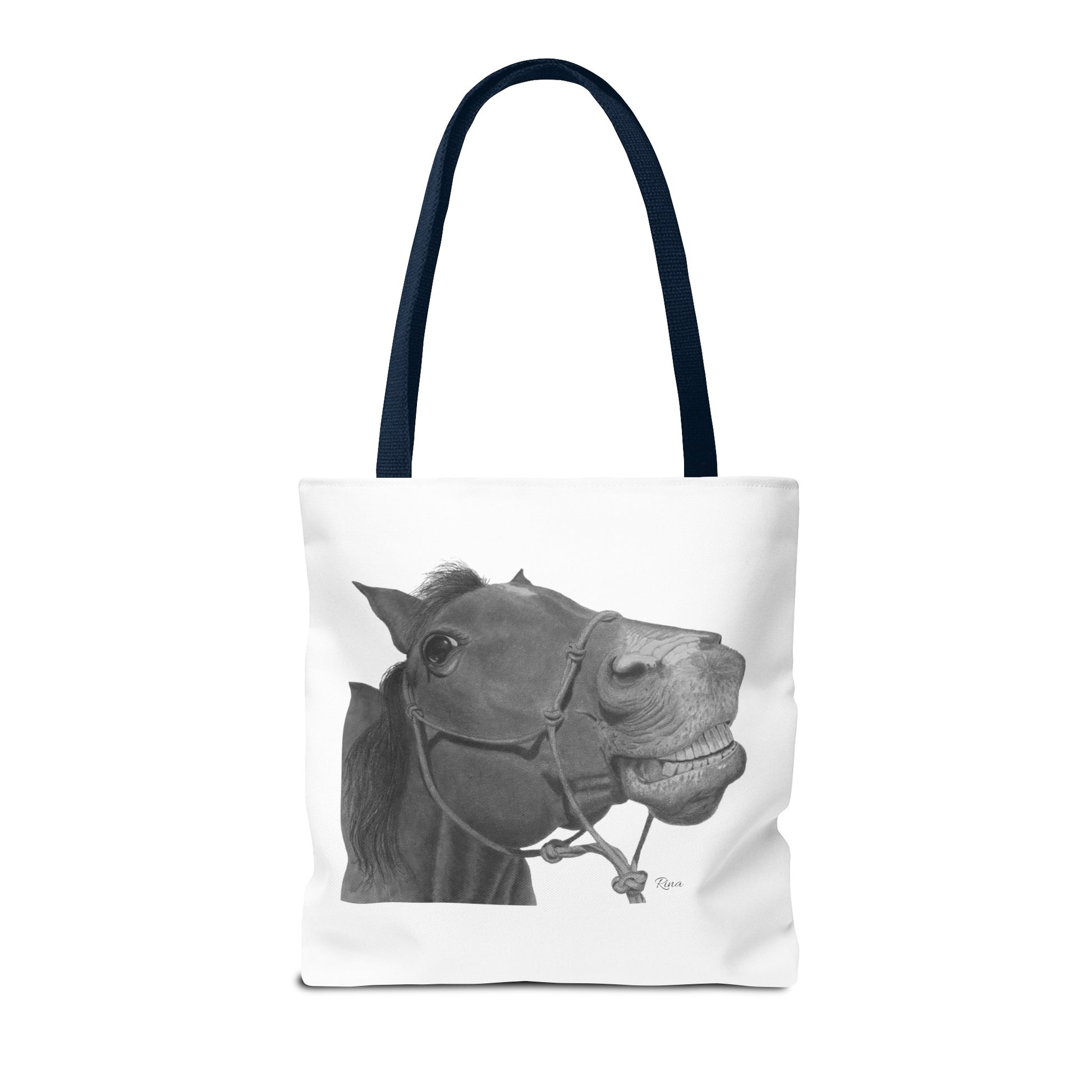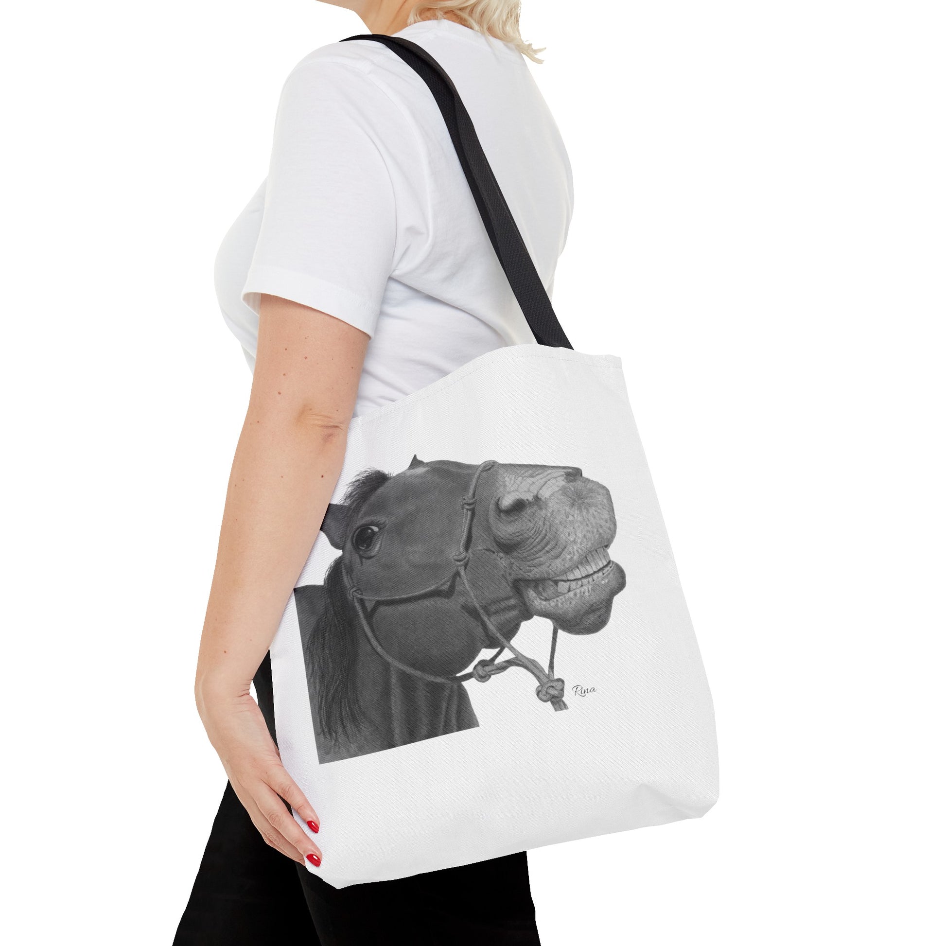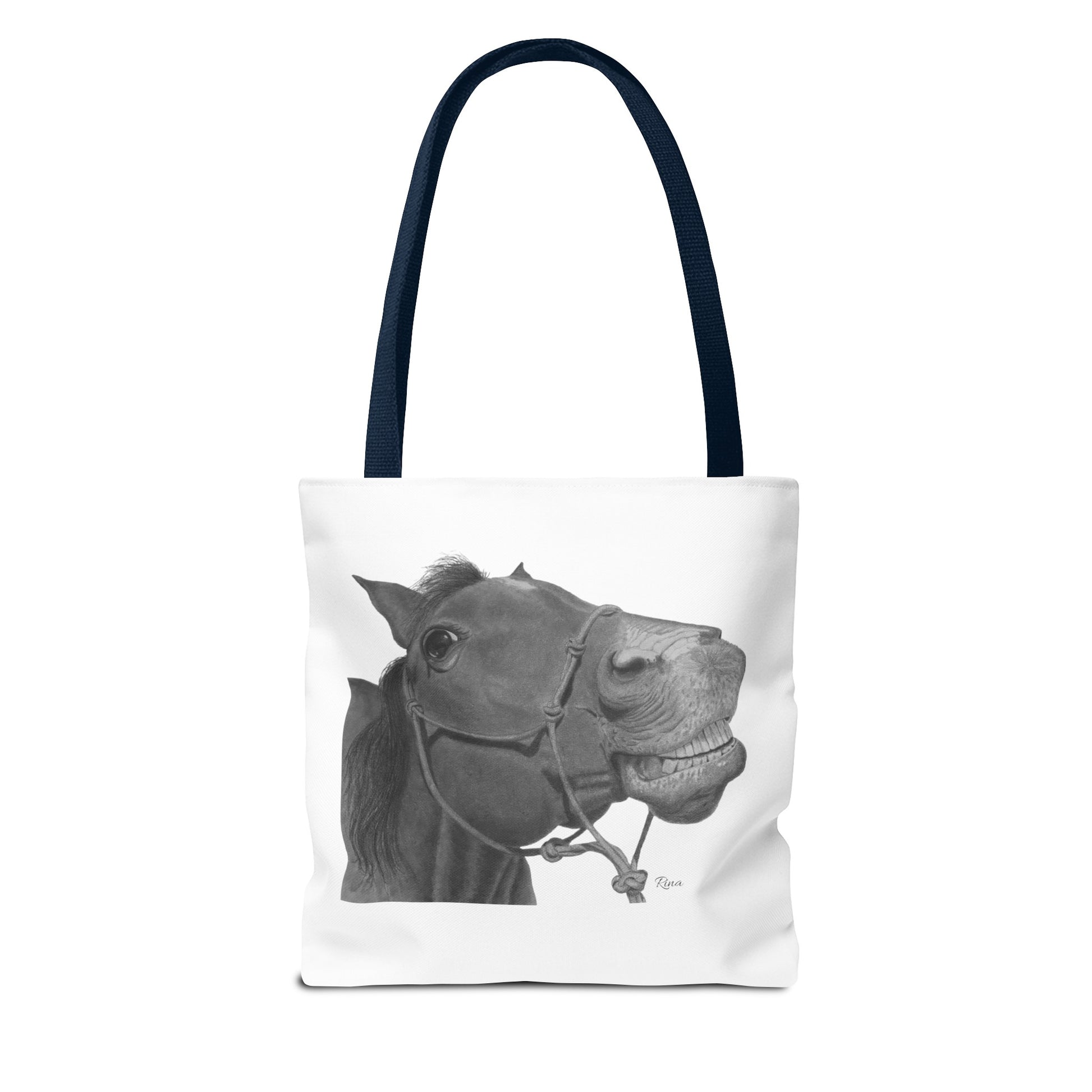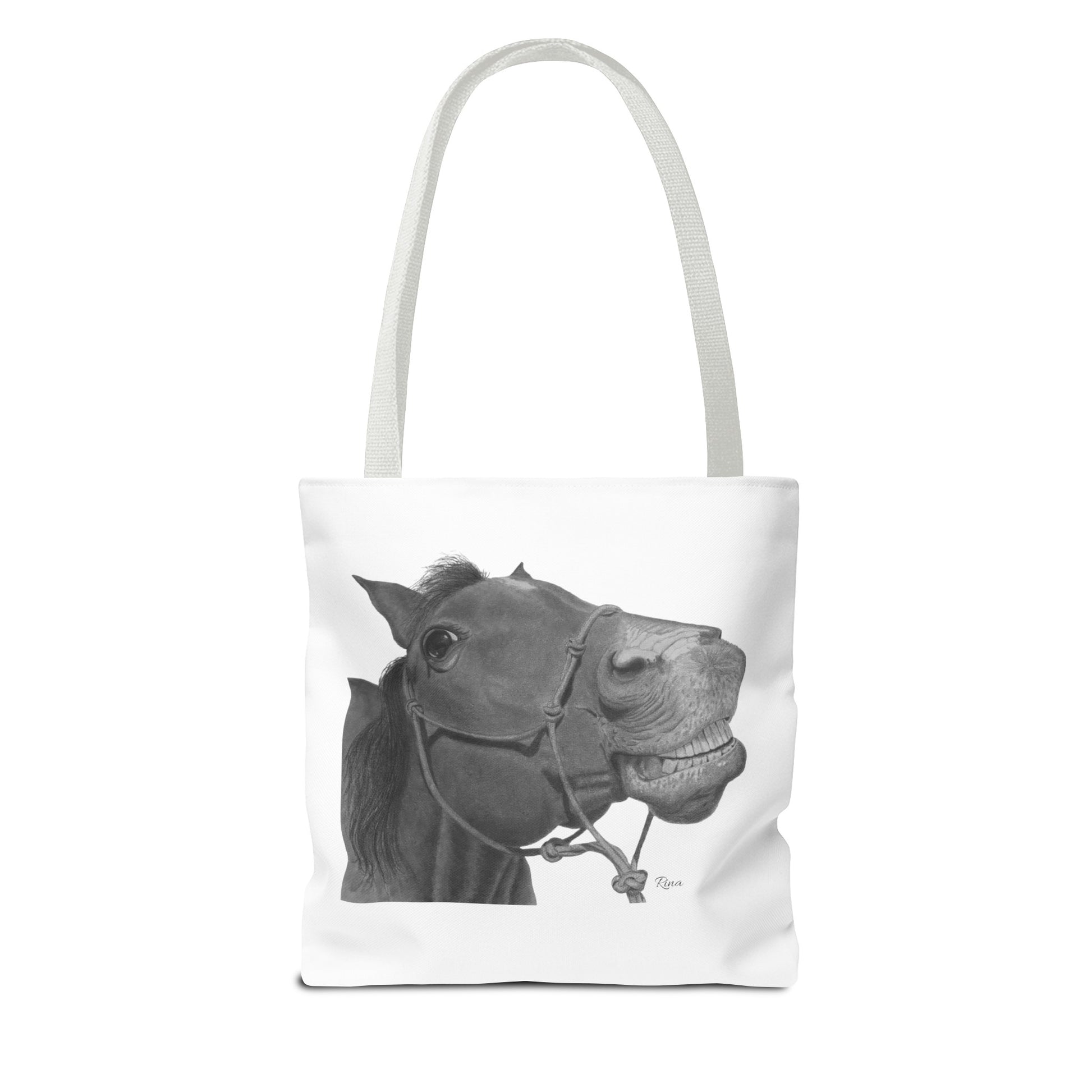 Design drawn and created by artist, Rina Vance! Hand drawn design printed on this cute tote bag! Take this happy horse with you everywhere and bring happiness along!