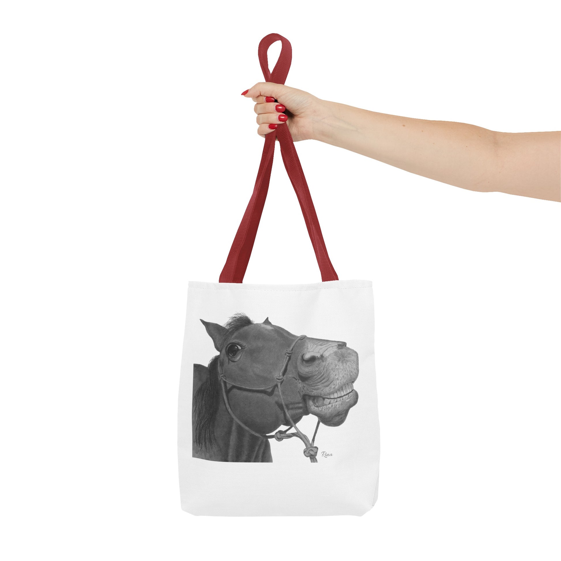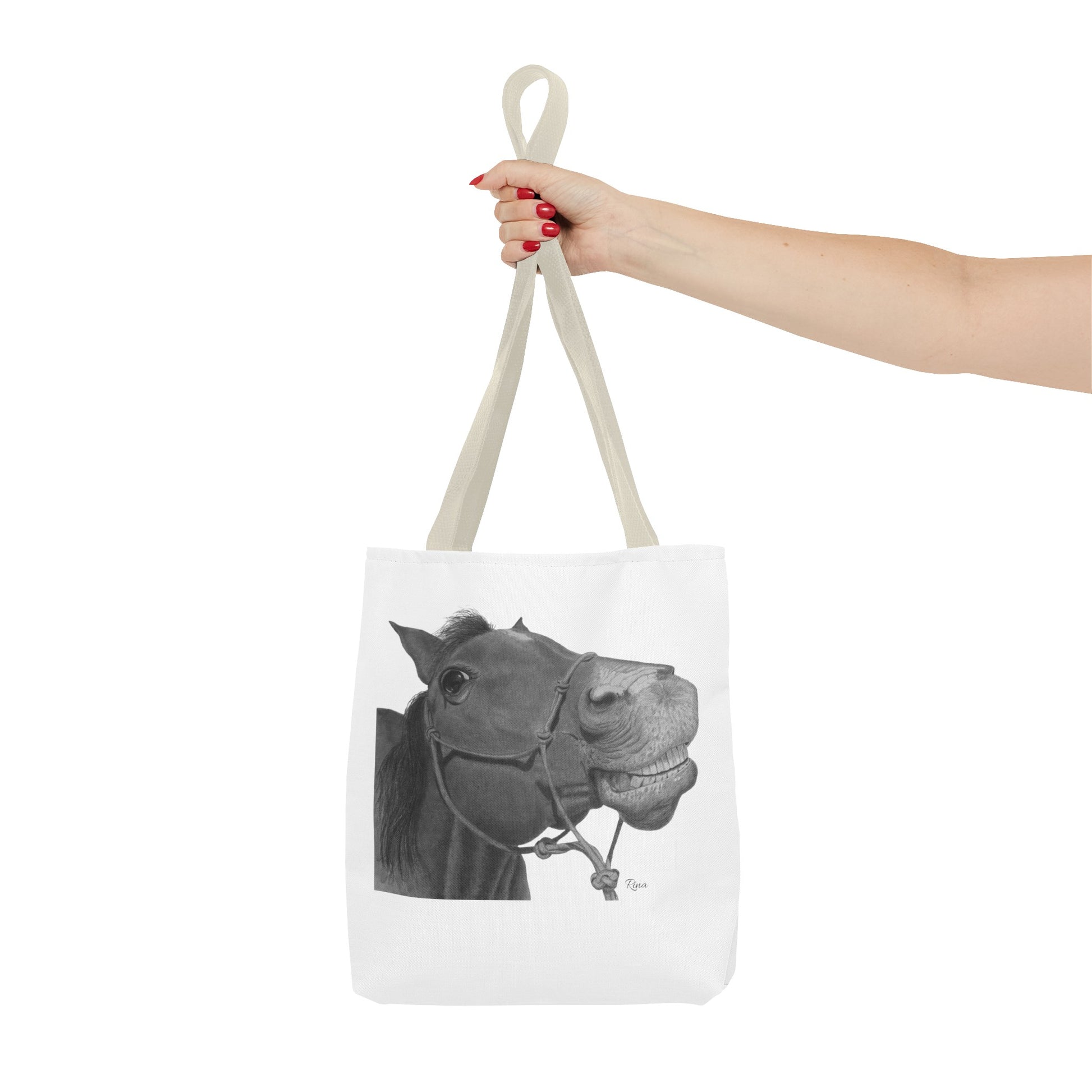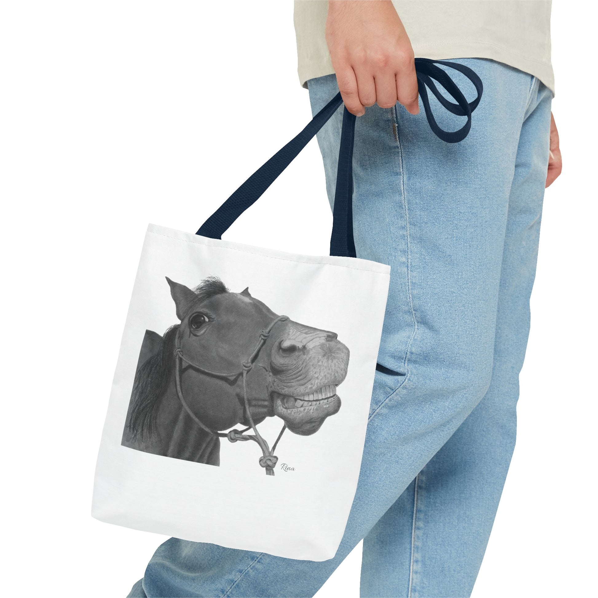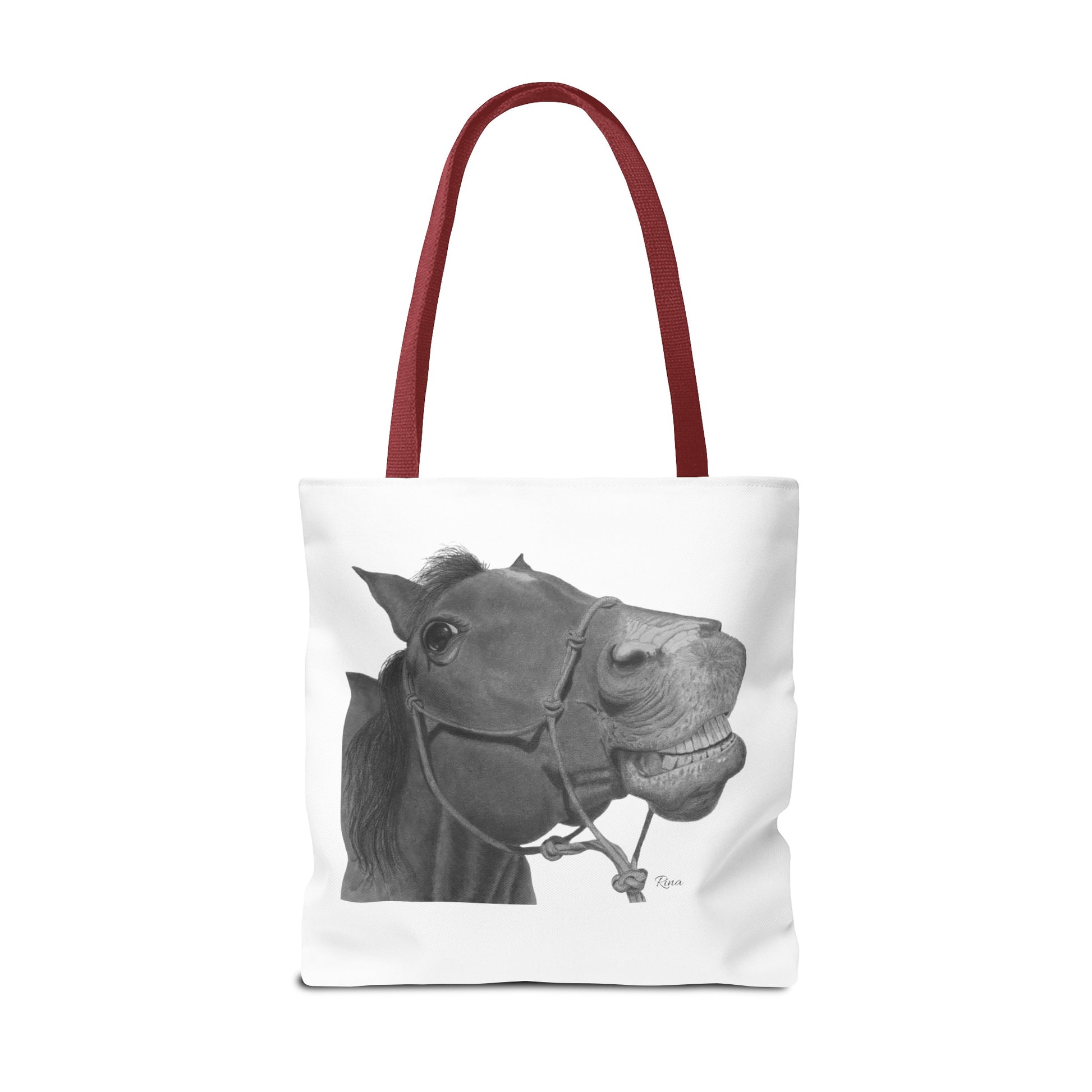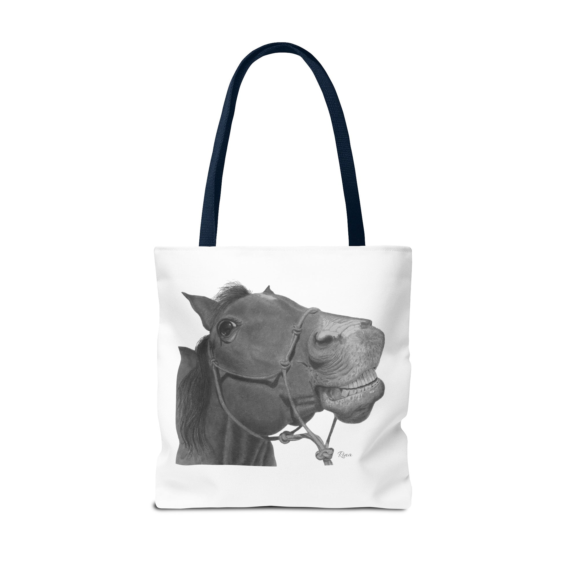 Design drawn and created by artist, Rina Vance! Hand drawn design printed on this cute tote bag! Take this happy horse with you everywhere and bring happiness along!