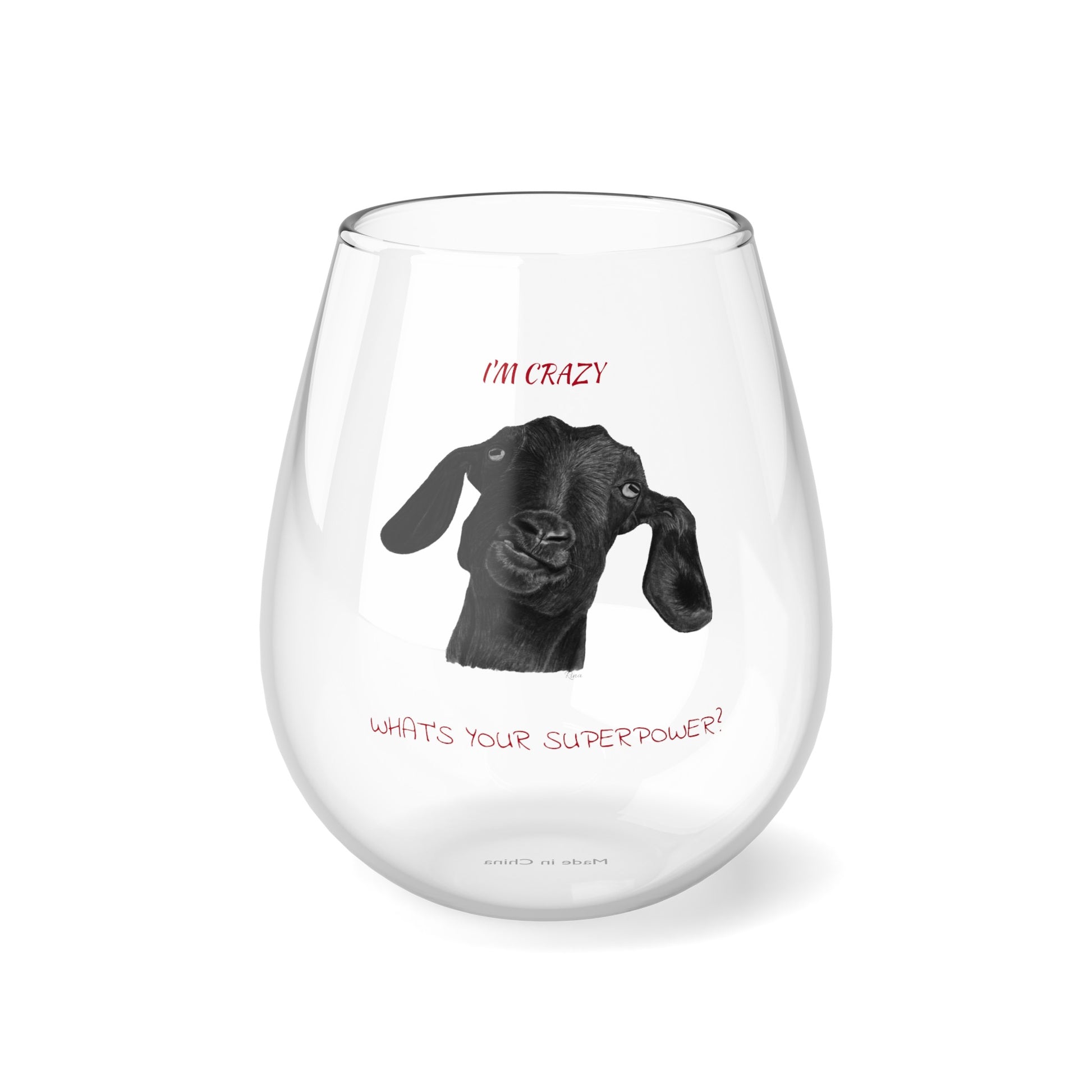 I'm Crazy What's Your Superpower Goofy Goat Stemless Wine Glass