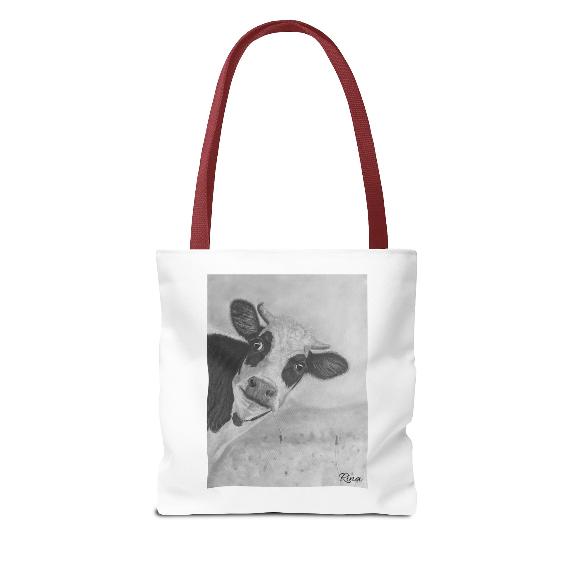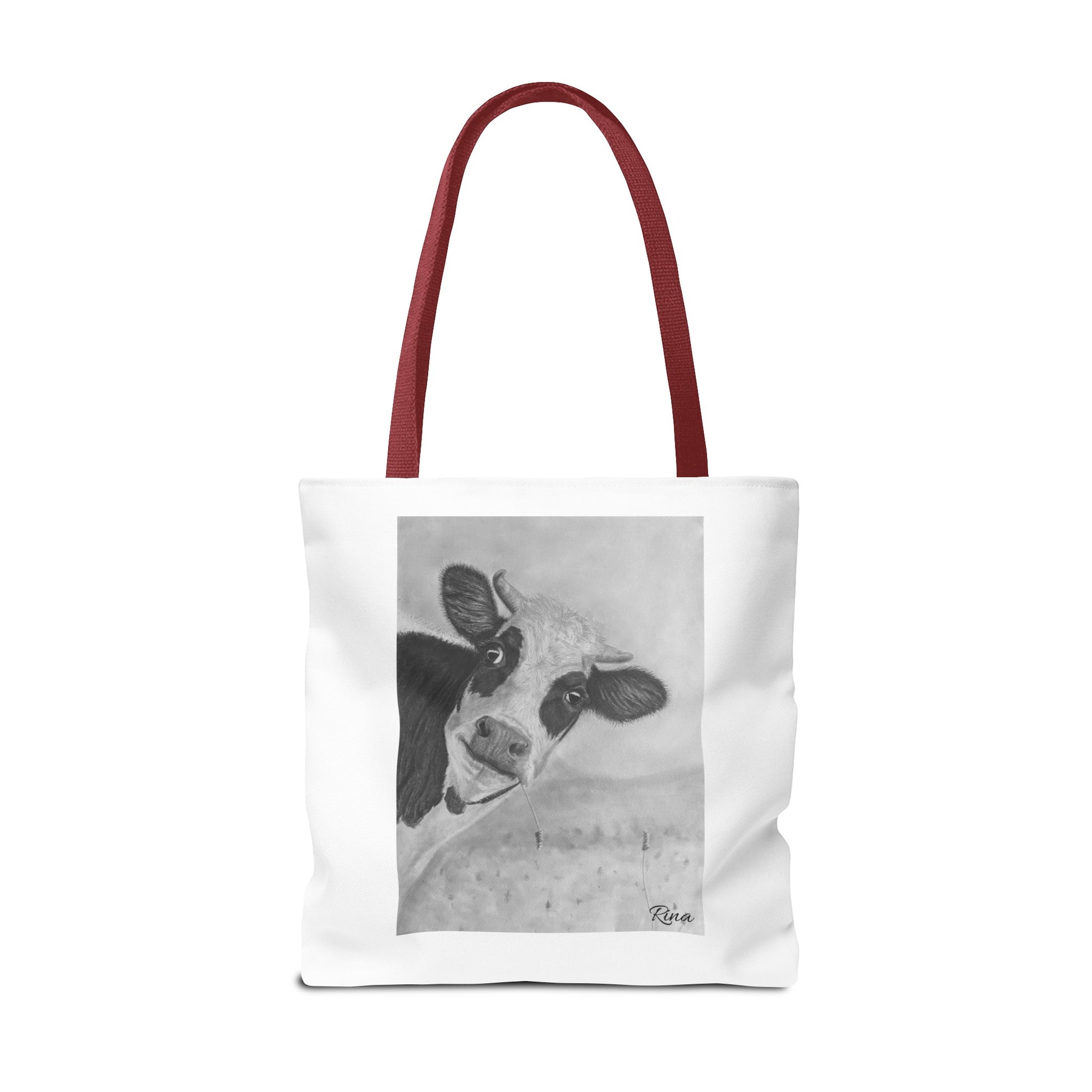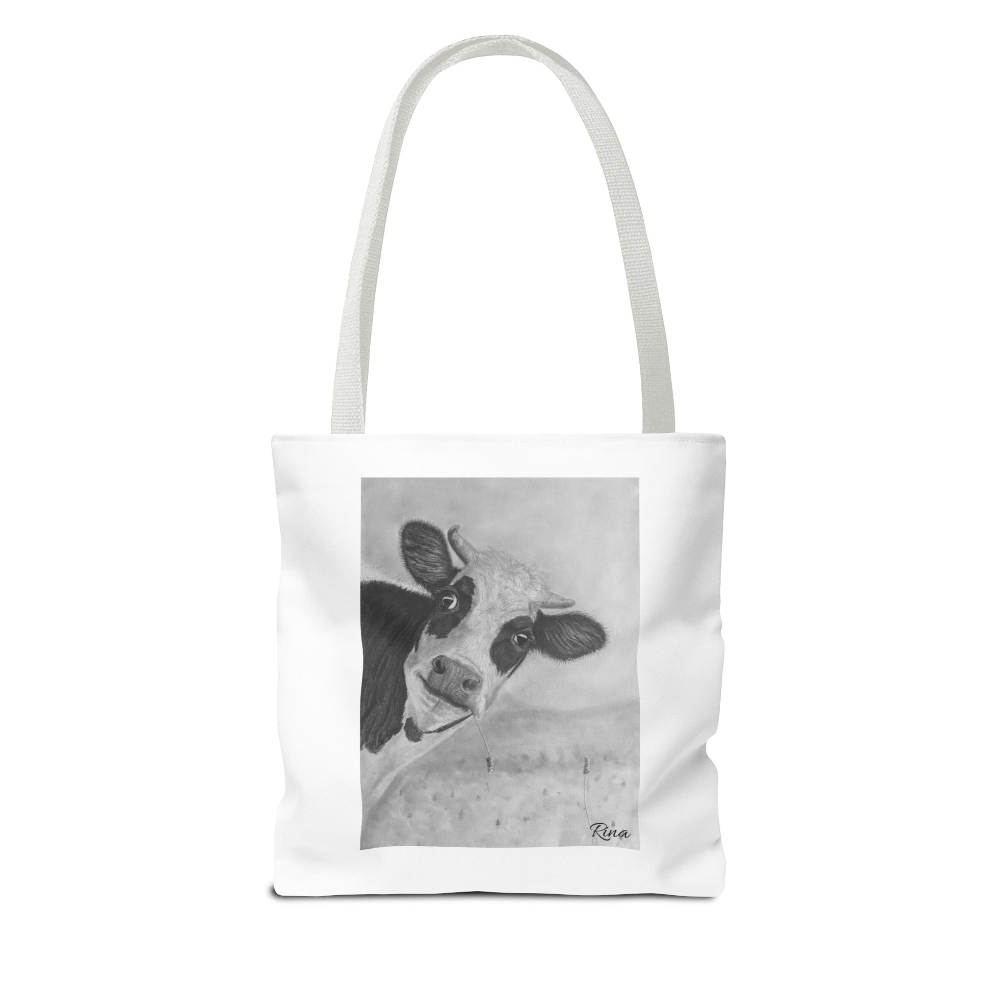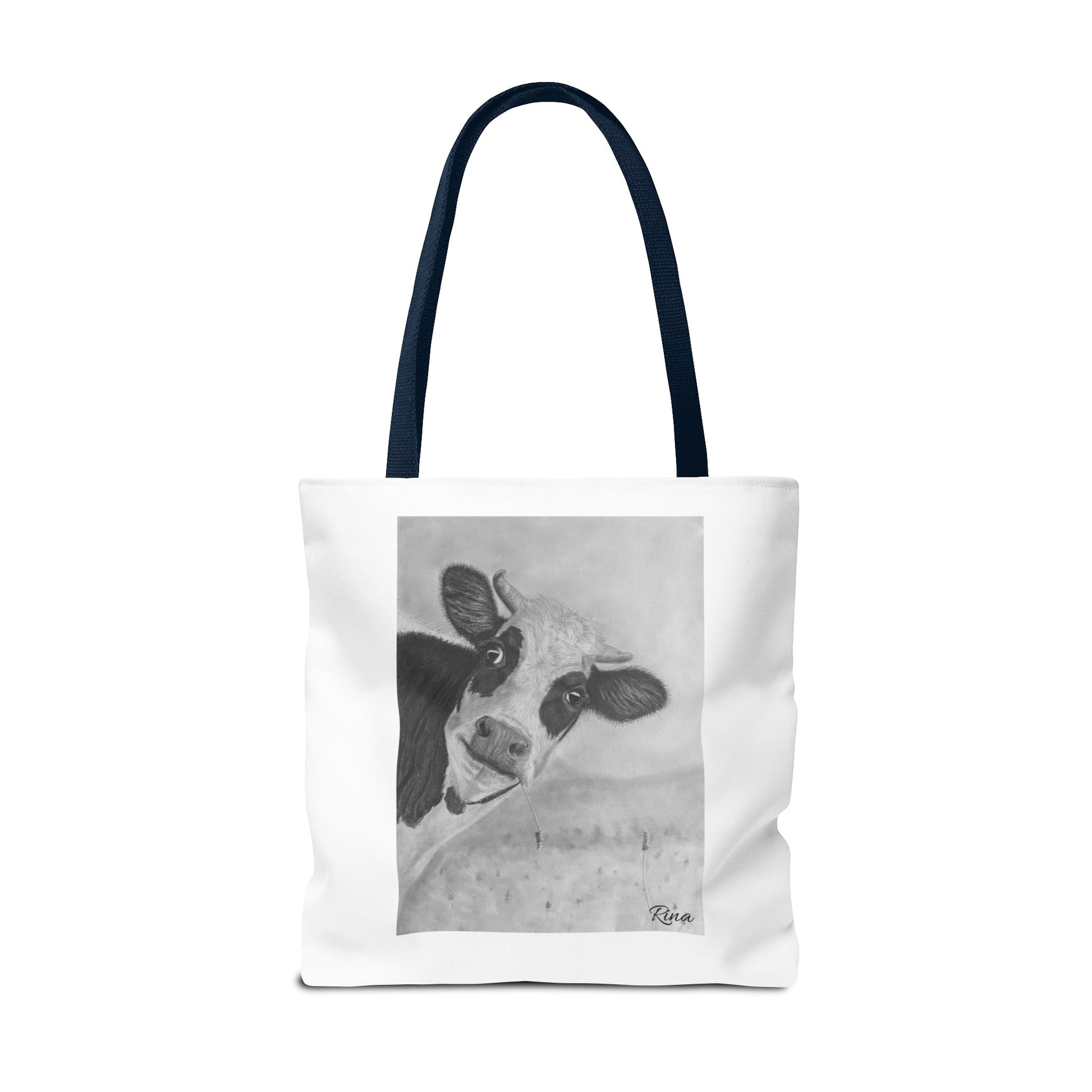Design drawn and created by artist, Rina Vance! Hand drawn design printed on this cute tote! Make a statement with the peek a boo cow!