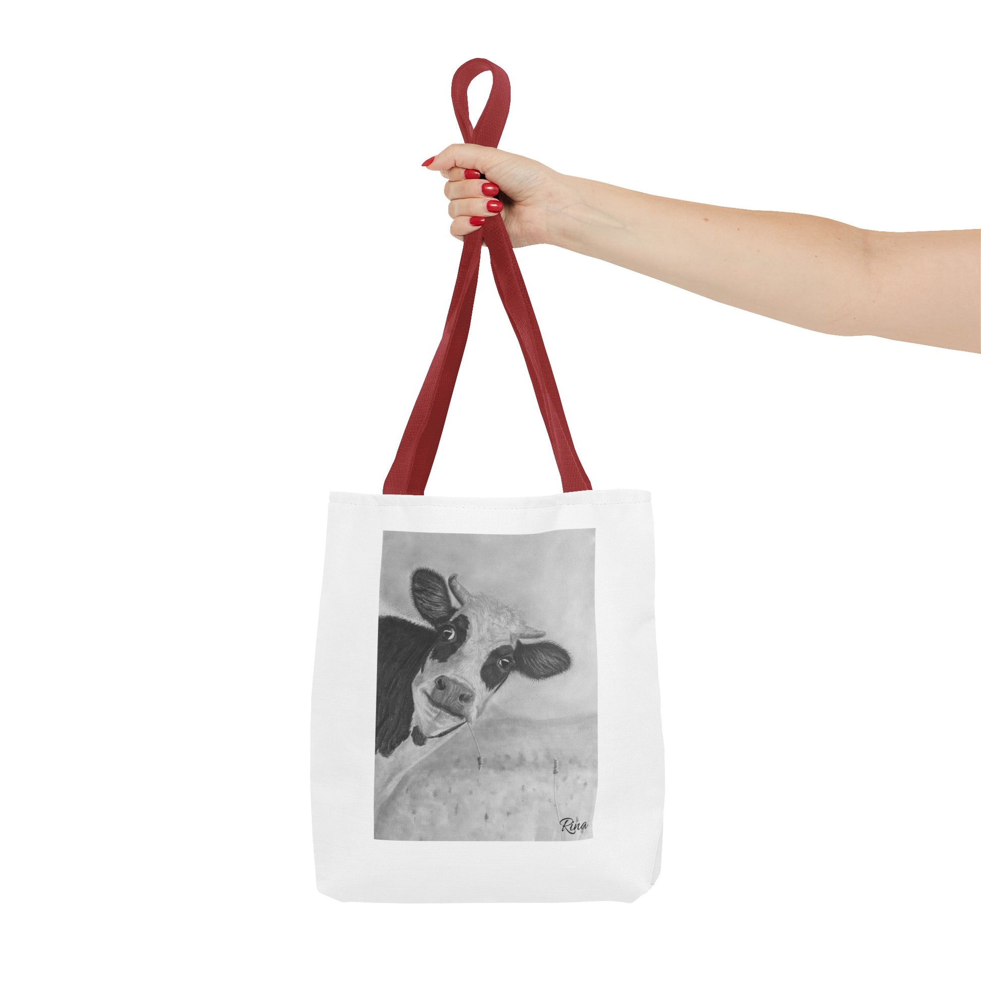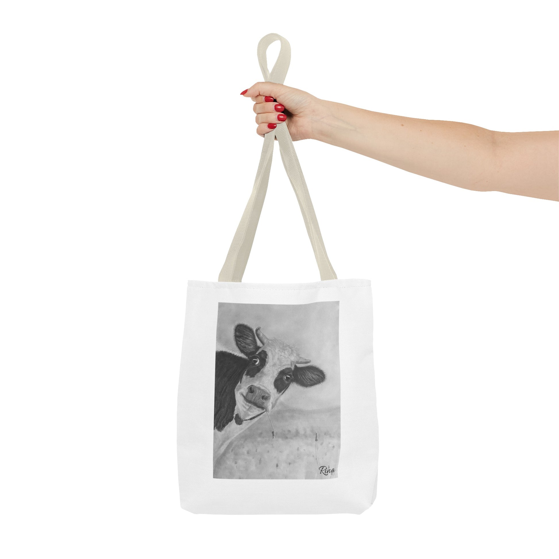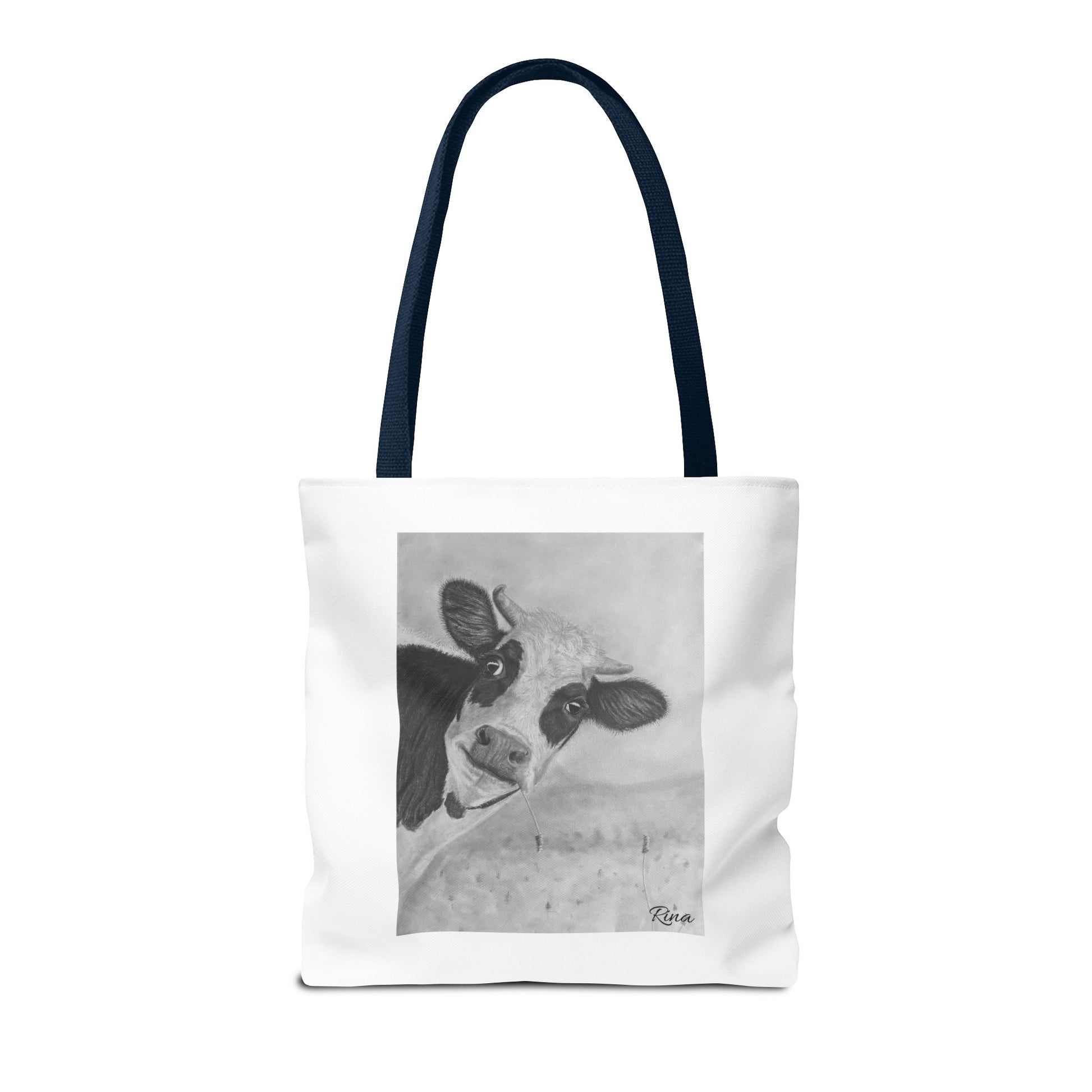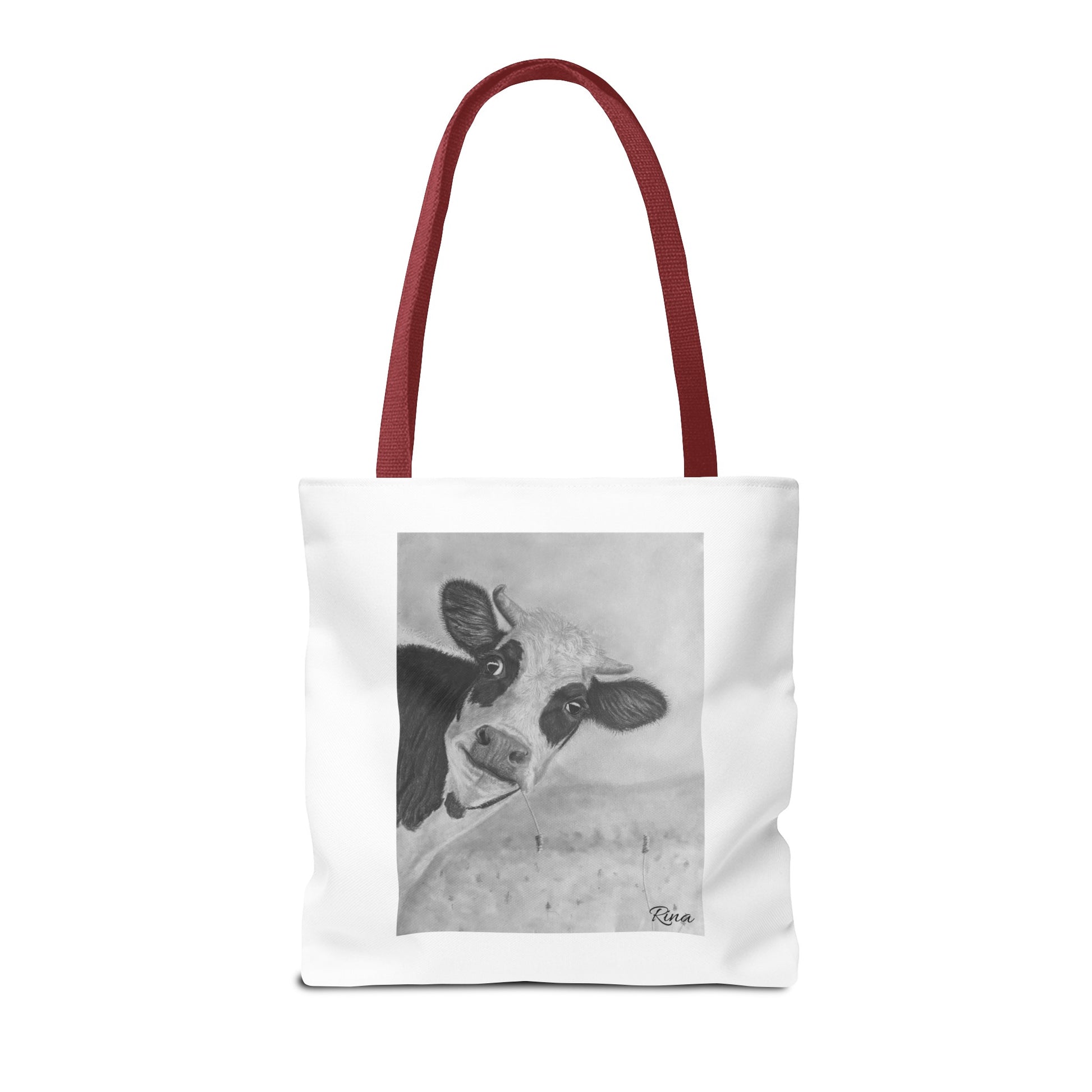 Design drawn and created by artist, Rina Vance! Hand drawn design printed on this cute tote! Make a statement with the peek a boo cow!
